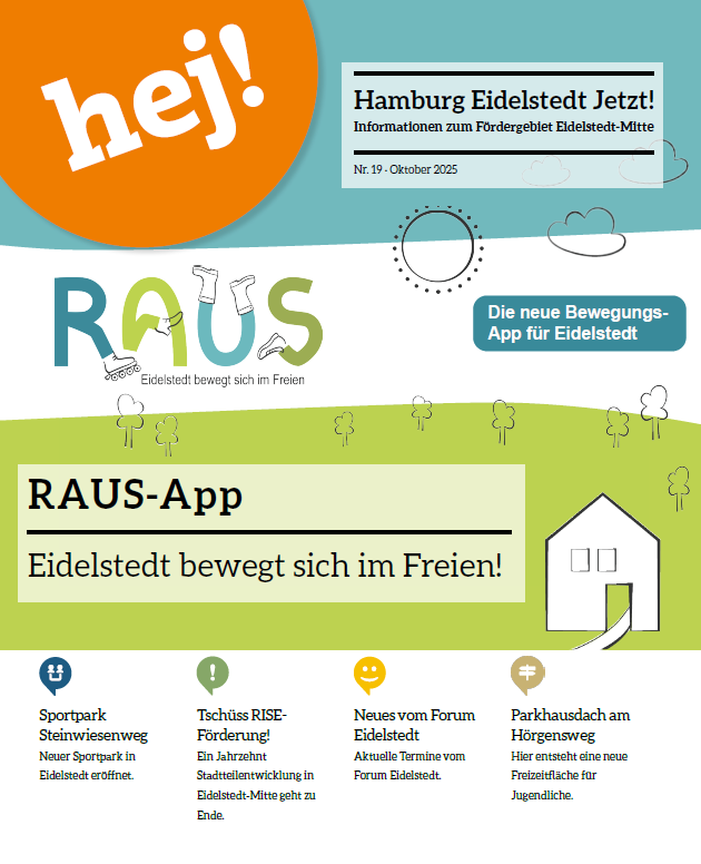In der letzten Ausgabe der Stadtteilzeitung berichten wir u.a. über die neue "RAUS"-App für Eidelstedt, die Einweihung des Sportparks Steinwiesenweg, die Umgestaltung des Parkhausdaches am Hörgensweg, Neues vom Forum Eidelstedt und verabschieden uns aus dem RISE-Gebiet Eidelstedt-Mitte!